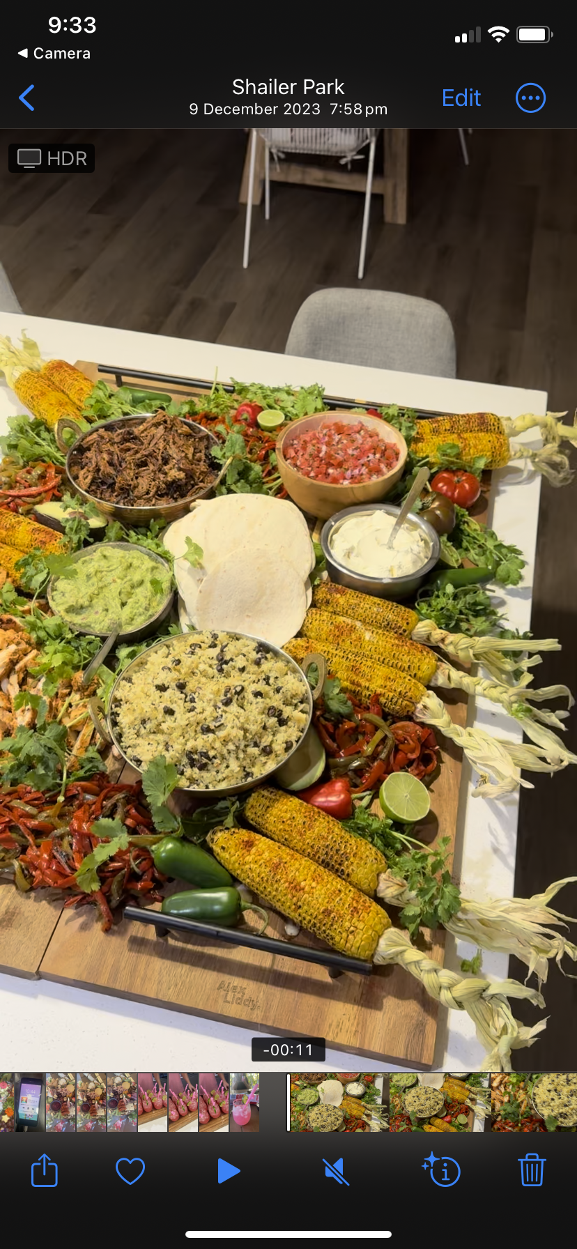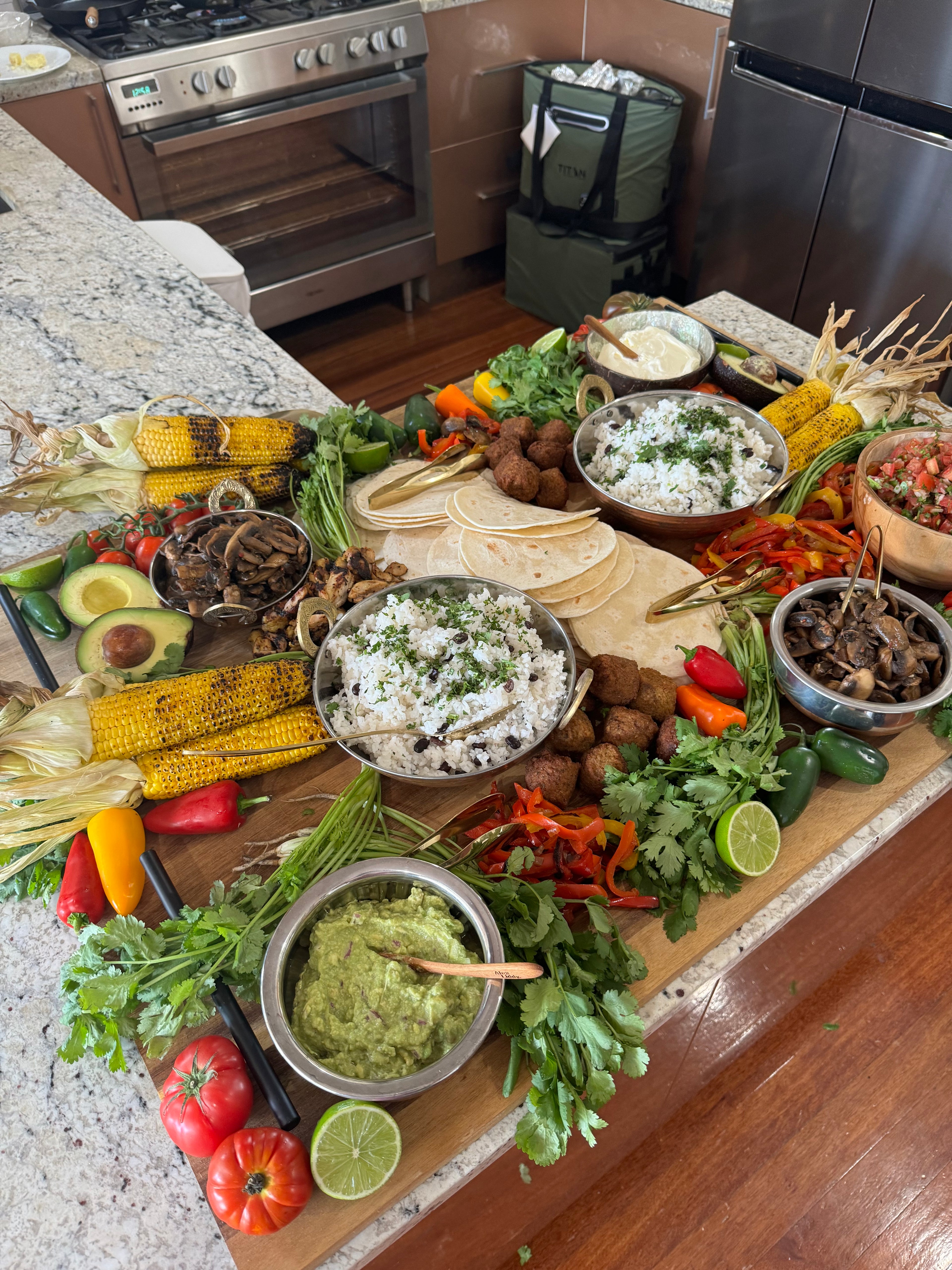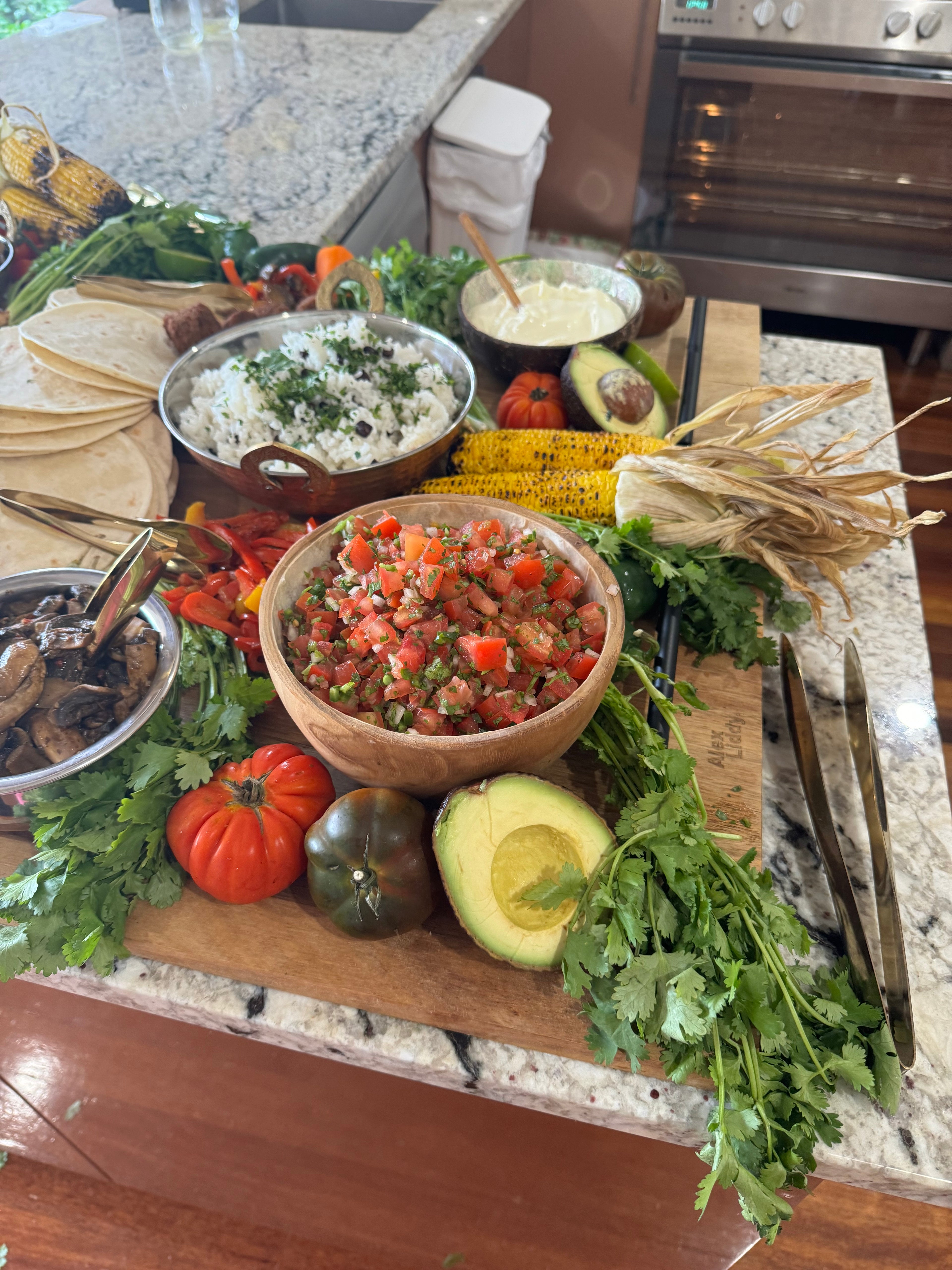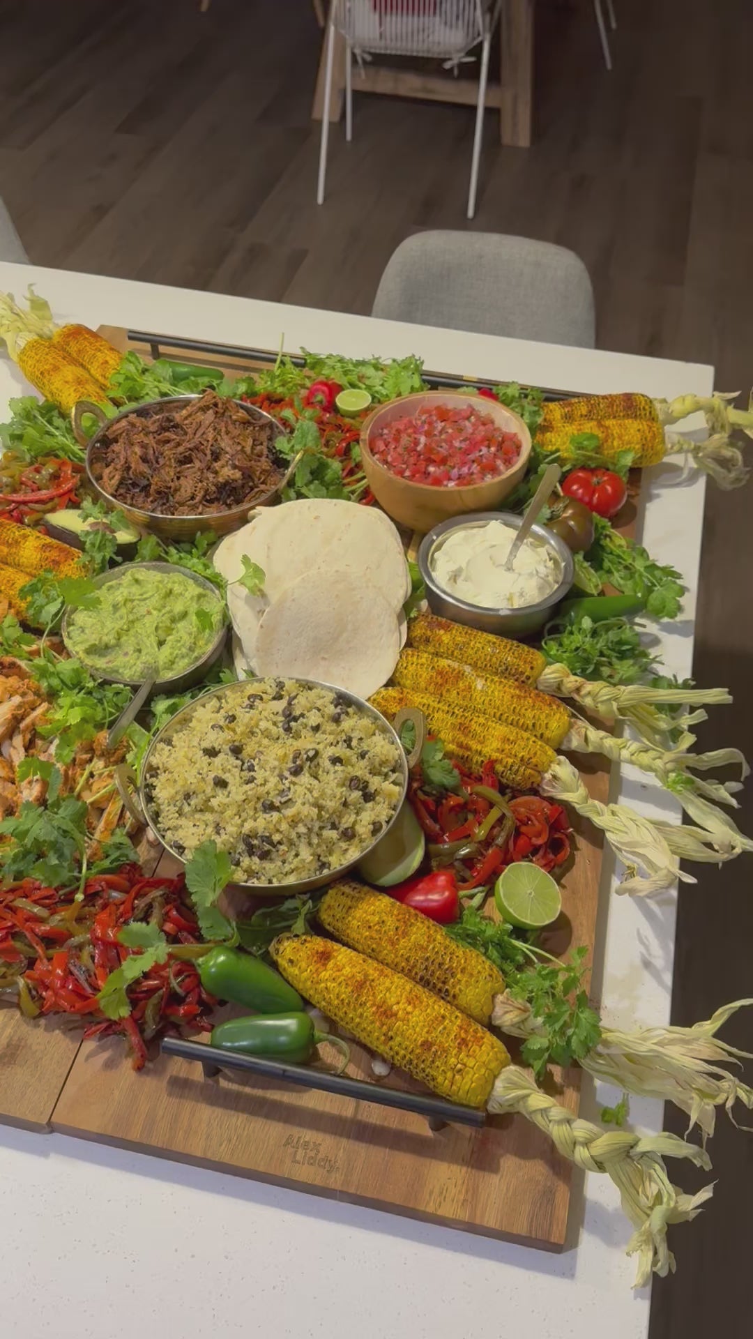 Our fajita board includes: slow cooked brisket, marinated chicken, pico de gallo (tomato salsa), black bean and coriander rice, sour cream, guacamole, charred capsicum, paprika charred corn braids and fajita wraps