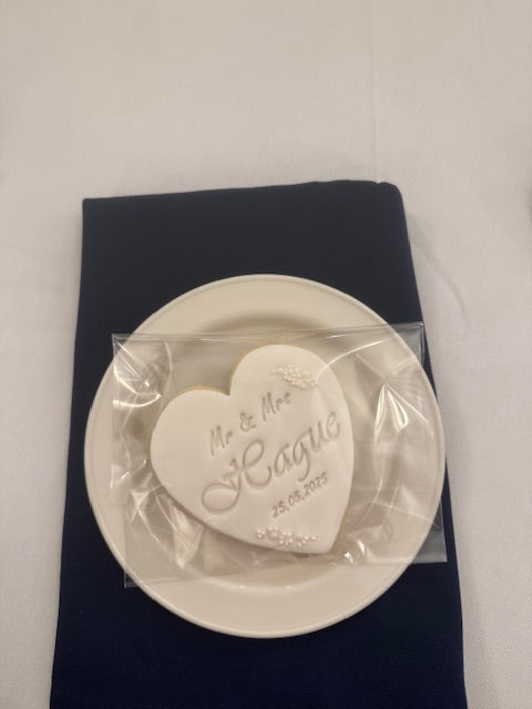 Create your own custom stamped sugar cookie. Pick a shape, colour and your message. For example the initials of the bride and groom. Each cookie is handmade with love and packaged individually.