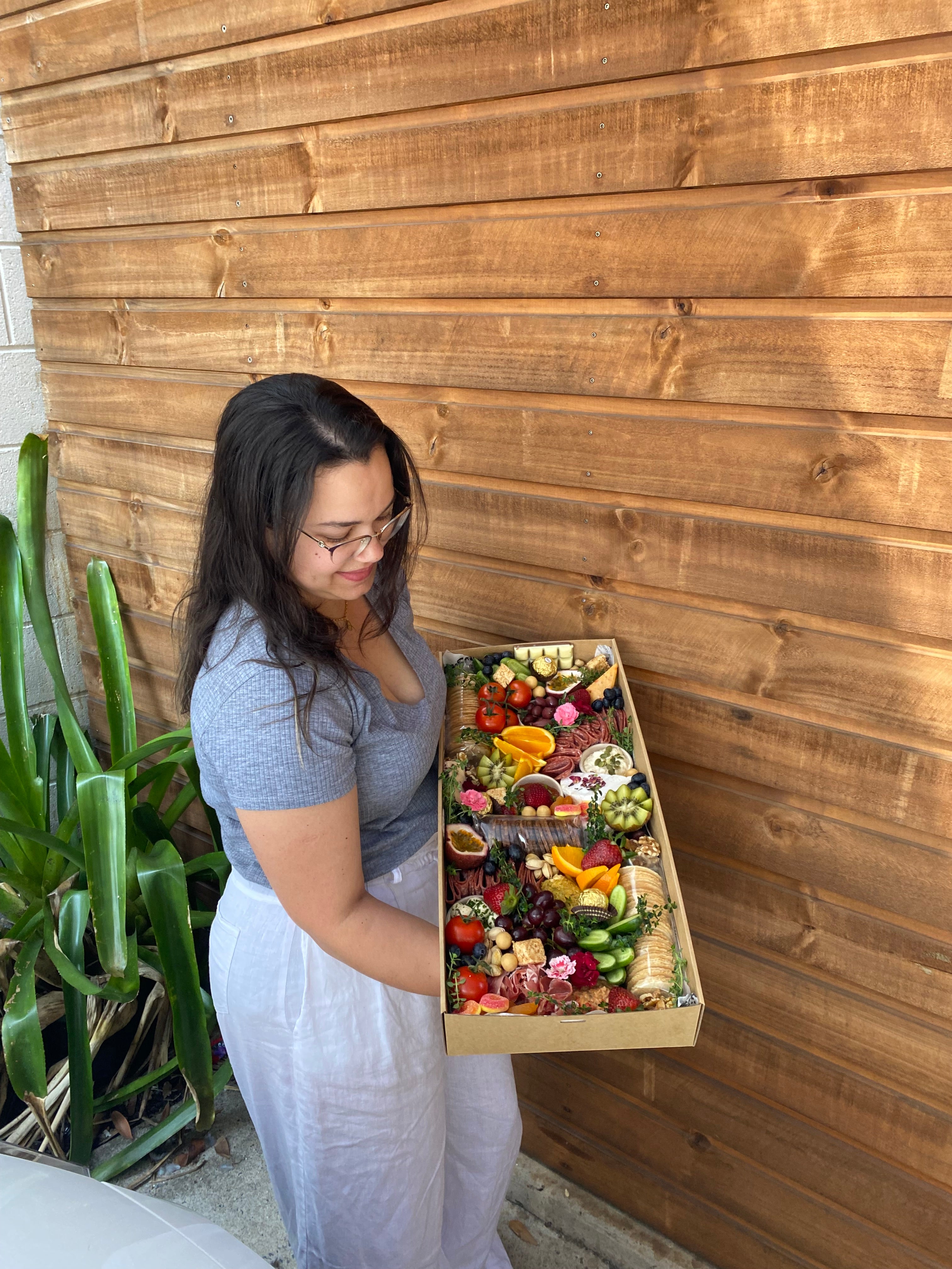 This box is the best of both worlds! A selection of gourmet cheeses, artisan crackers, antipasto ingredients, dips, the finest cold meats, nuts, chutney, chocolate squares, Ferrero Roche, peach lollies, gold maltesers, toasted marshmallows and other fresh produce.